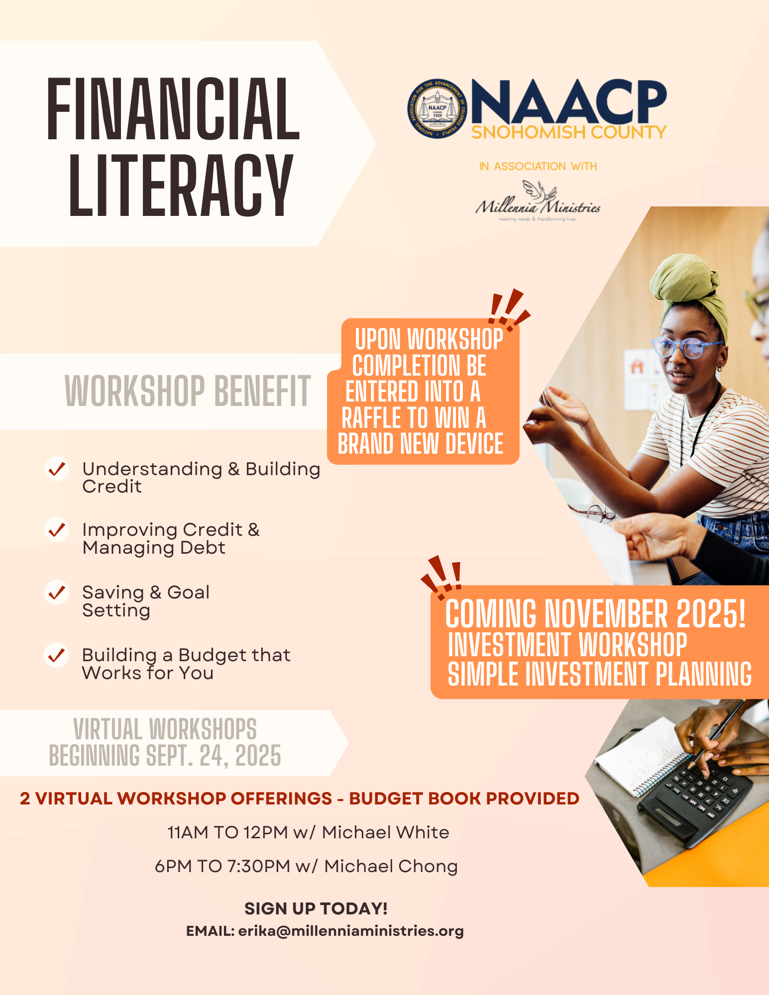 NAACP Snohomish County, in collaboration with Millennia Ministries, is hosting free virtual Financial Literacy Workshops. Learn how to build and improve credit, manage debt, save, set goals, and create a budget. Two sessions will be offered on September 24, 2025, with an additional Investment Workshop coming in November.
